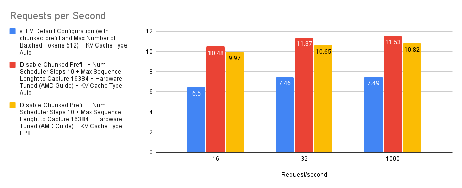 Based on the experiment we ran, we found that there’s a slight improvement with tuning the chunked prefill values over disabling the chunked prefill feature. However, if you’re not sure whether to enable chunked prefill or not, simply start off by disabling it and you should generally expect better performance than with using the default settings. This is specific to MI300X GPUs.