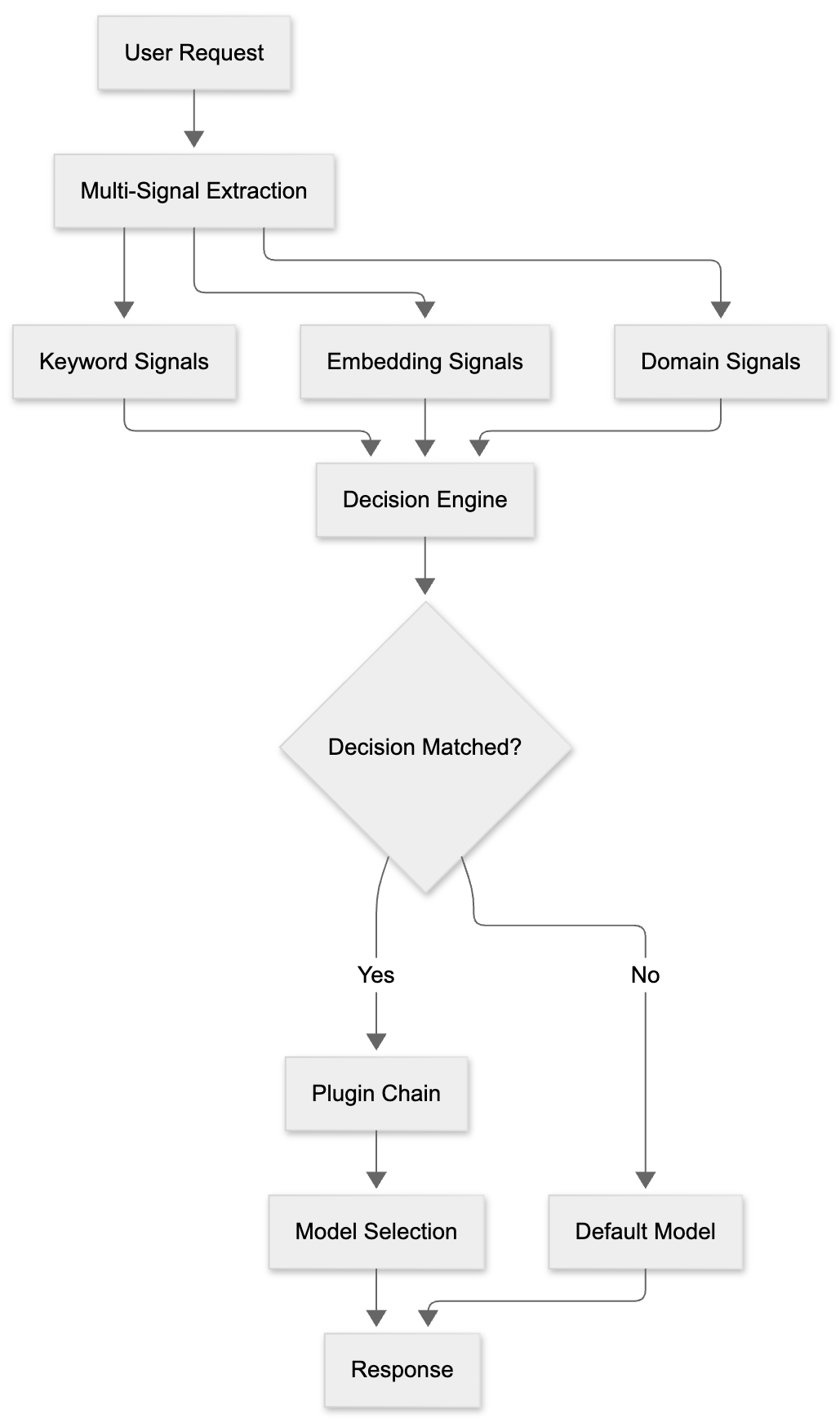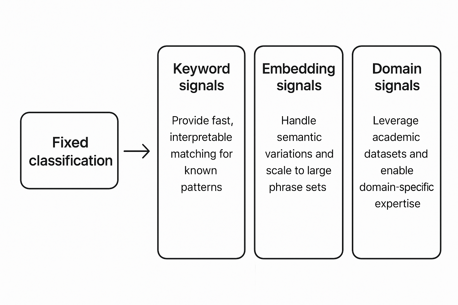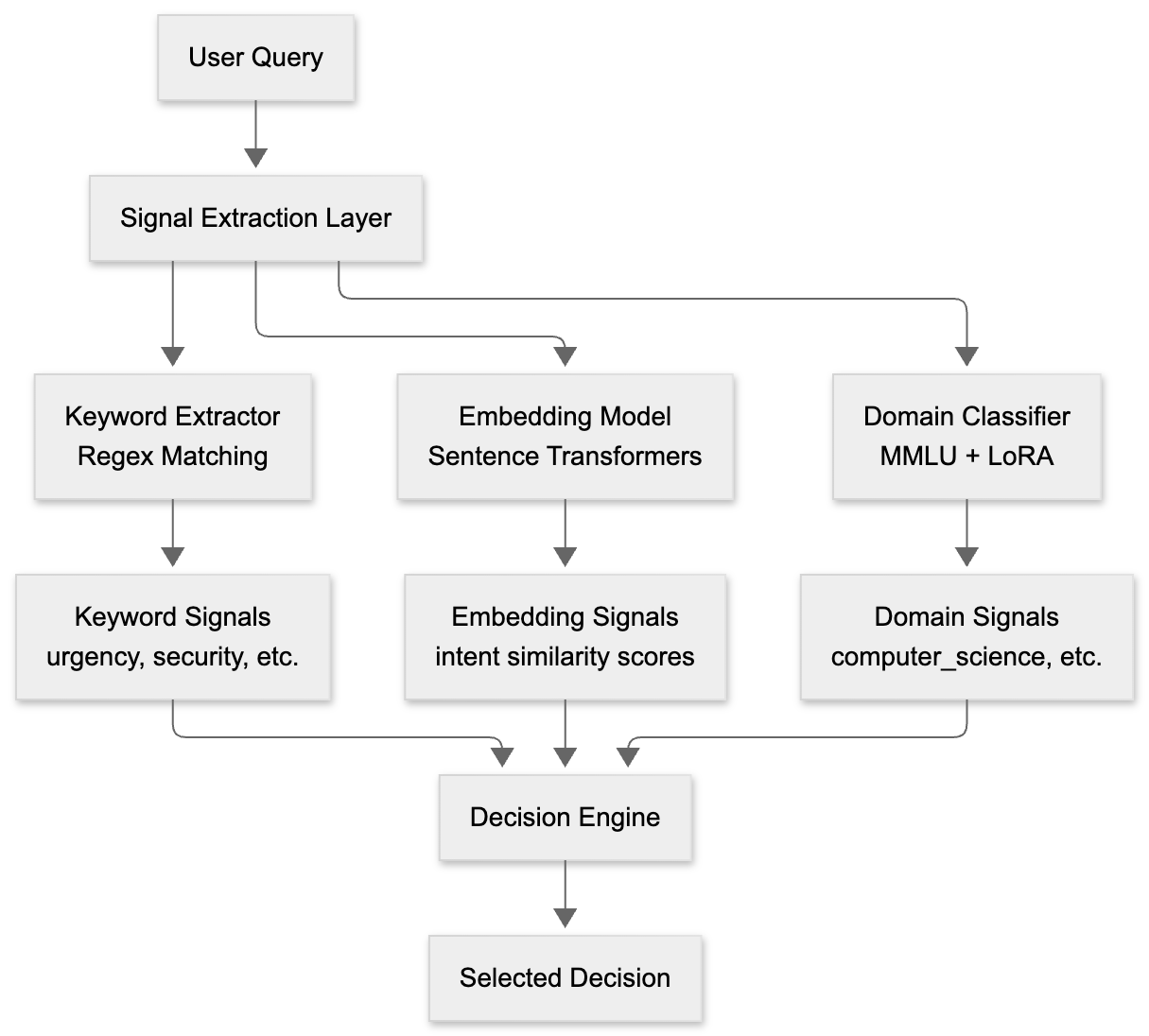 By combining all three, the Signal-Decision Architecture captures multiple dimensions of user intent simultaneously, enabling far more sophisticated routing logic than any single signal type could achieve.